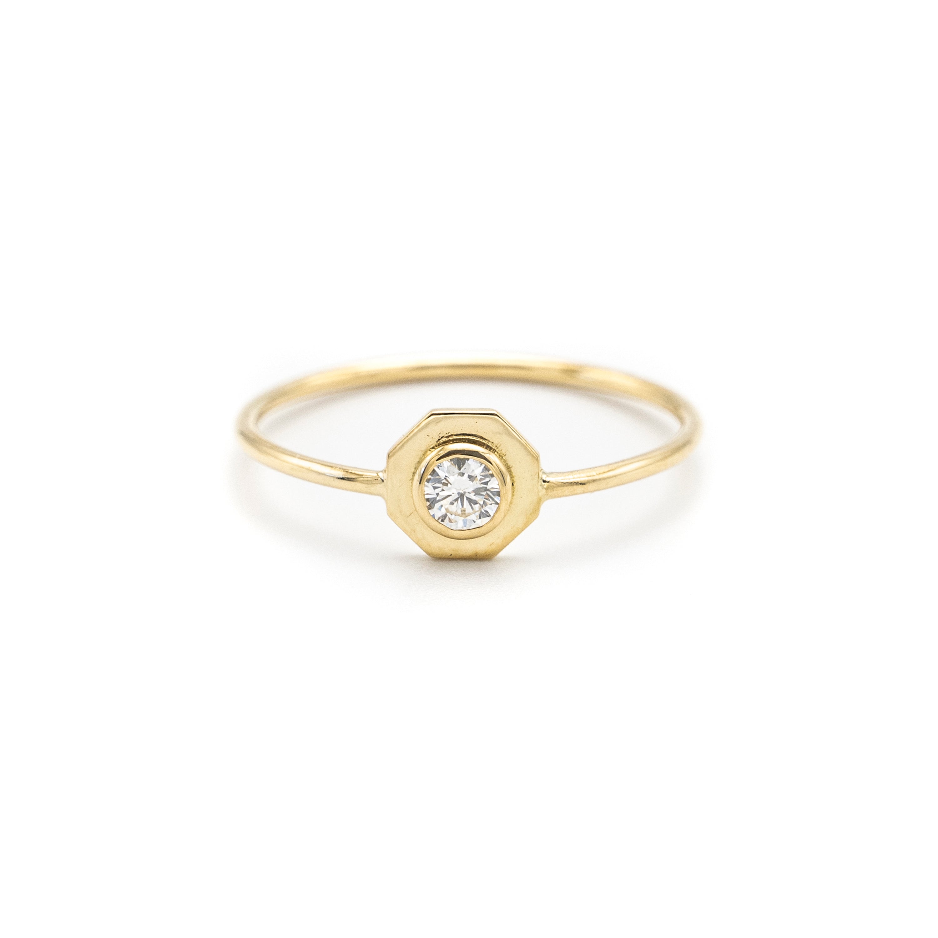 Modern simplicity is captured perfectly in this solitaire ring. A single 0.10ct round brilliant cut diamond is set on a thin octagonal plate representing rebirth and renewal.