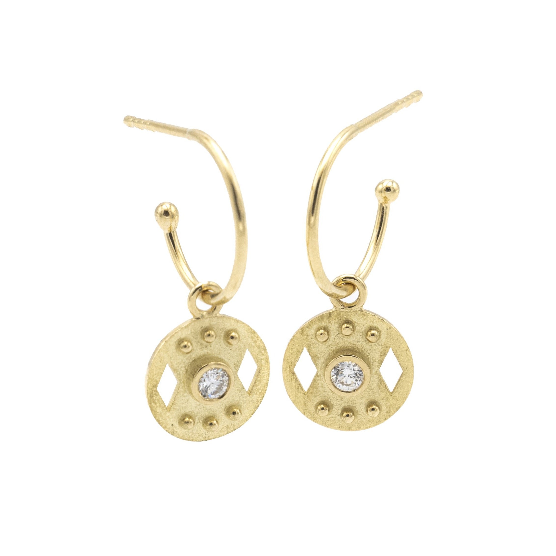 Hand cut windows into the past with a modern twist, our Zoe hoops are versatile and can be worn with and without the dangling charms. Set with 0.12 cts of round brilliant cut diamonds, these are the hoops that can be paired with both a t-shirt and an evening dress. Sold as a pair.