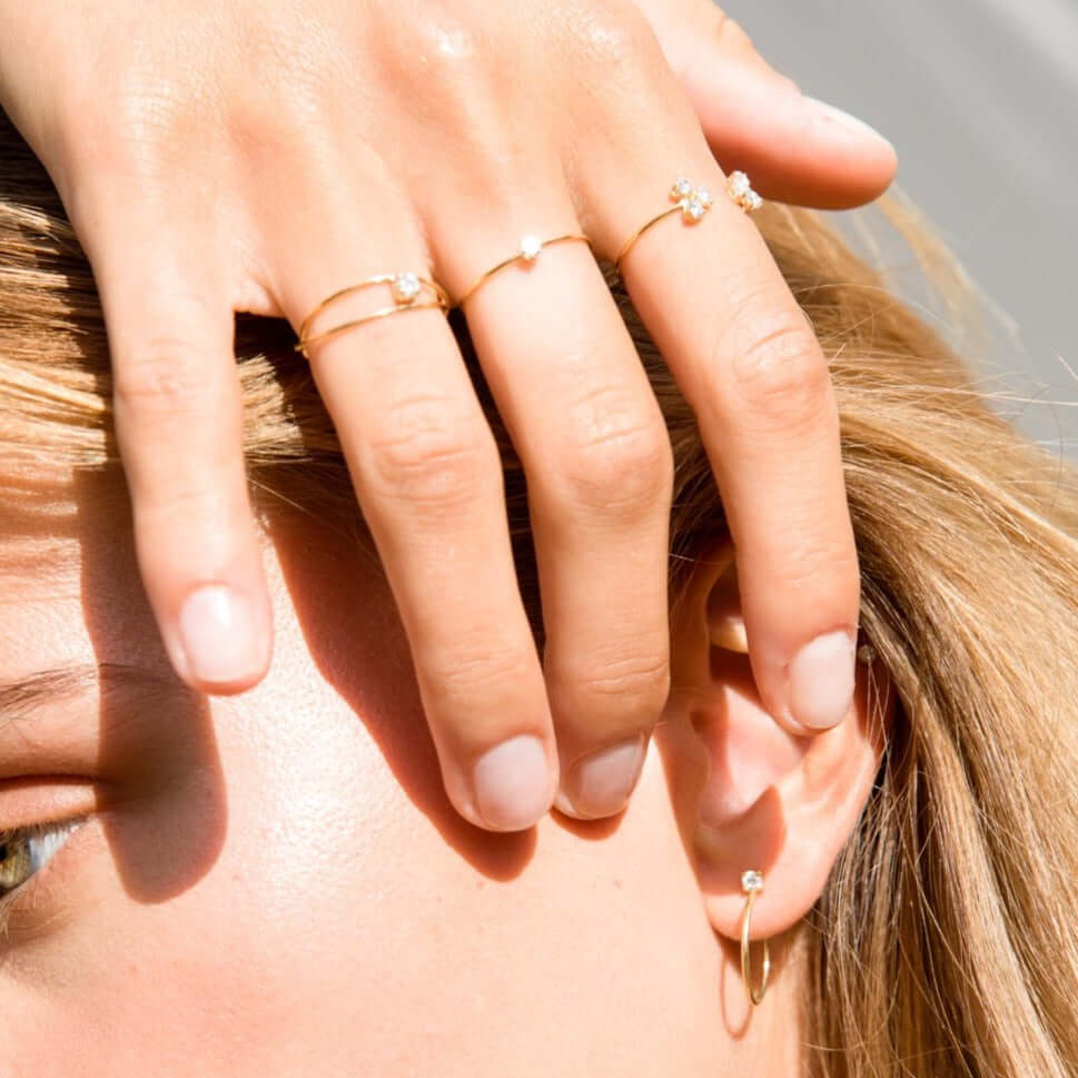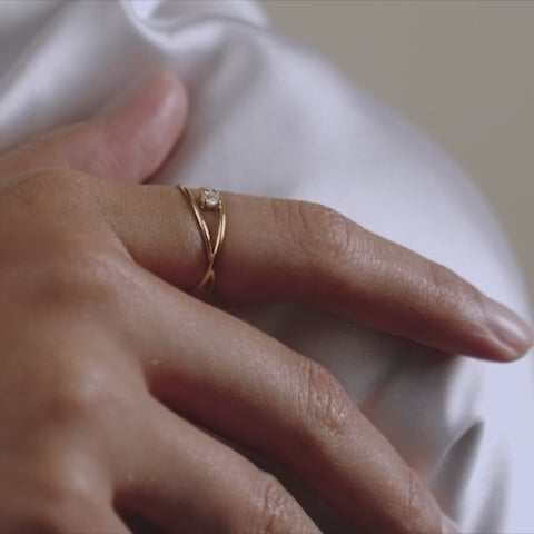Representing the paths that cross and the stories that merge across time and space: a 0.10ct diamond floats between intersecting golden rings. Our Parallax Ring intrigues and astonishes.